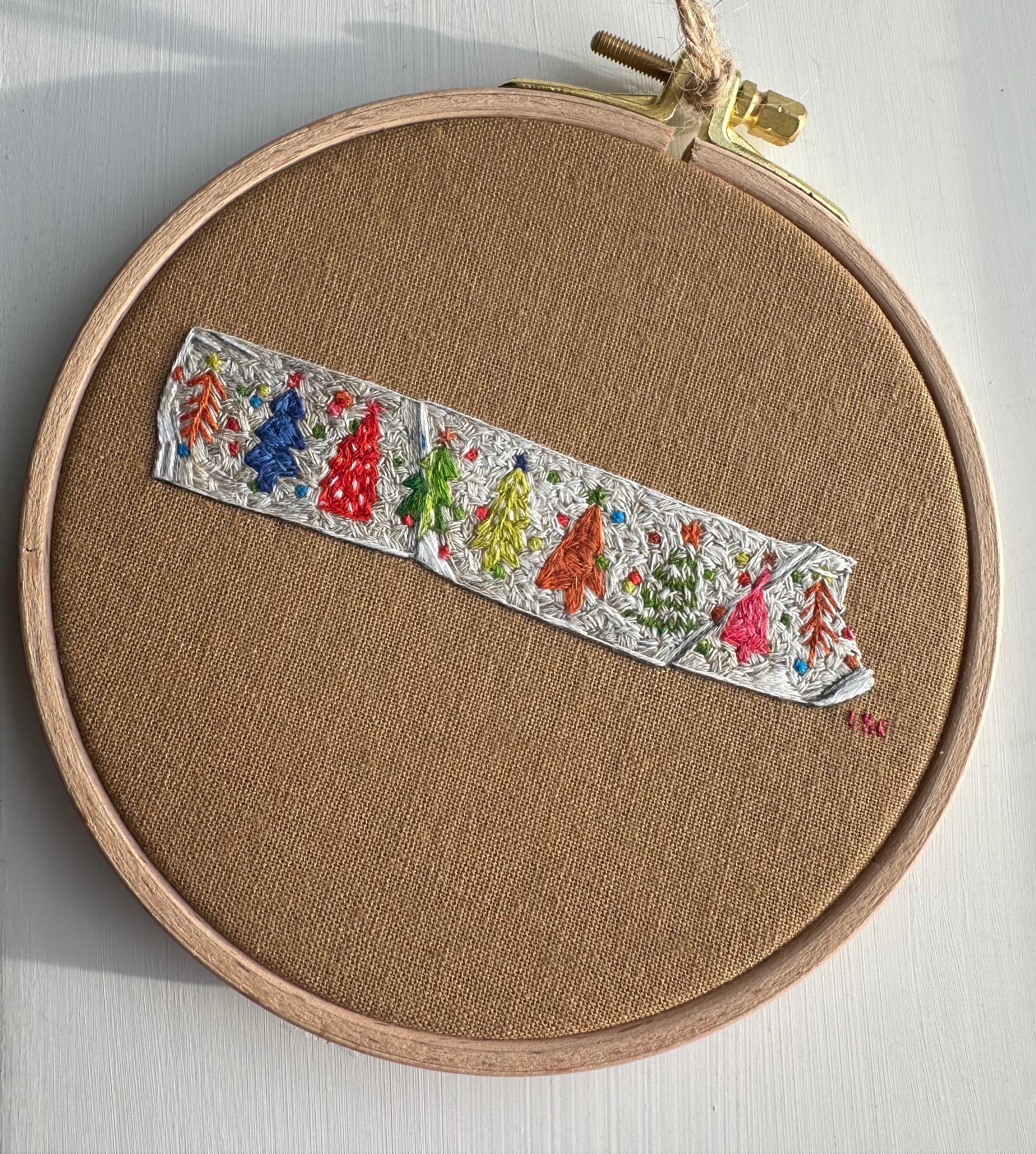 A one off piece depicting Christmas tree tape. Stitched using DMC cotton thread onto tan linen/cotton fabric. Displayed in a 5.5 inch dismeter embroidery hoop.